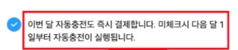 자동충전을 재설정하실 때 페이지 하단의 아래 옵션을 체크하시면 당월 즉시 결제와 동시에 자동충전 신청이 이루어집니다. (해당 옵션은 매 월 1~3일에만 표시됩니다.)