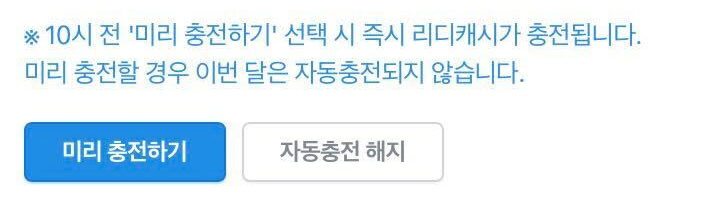 매월 1일 오전 10시부터 순차적으로 자동충전이 시작되어 경우에 따라 충전이 지연될 수 있습니다.(최대 5시간 소요) 오전 10시 이전 결제를 희망하시는 경우 [미리 충전하기] 선택 시 즉시 리디캐시가 충전됩니다. (미리 충전하기 서비스는 매월 1일 0시부터 9시 59분까지 선택이 가능합니다.) #자동 충전 설정 바로가기