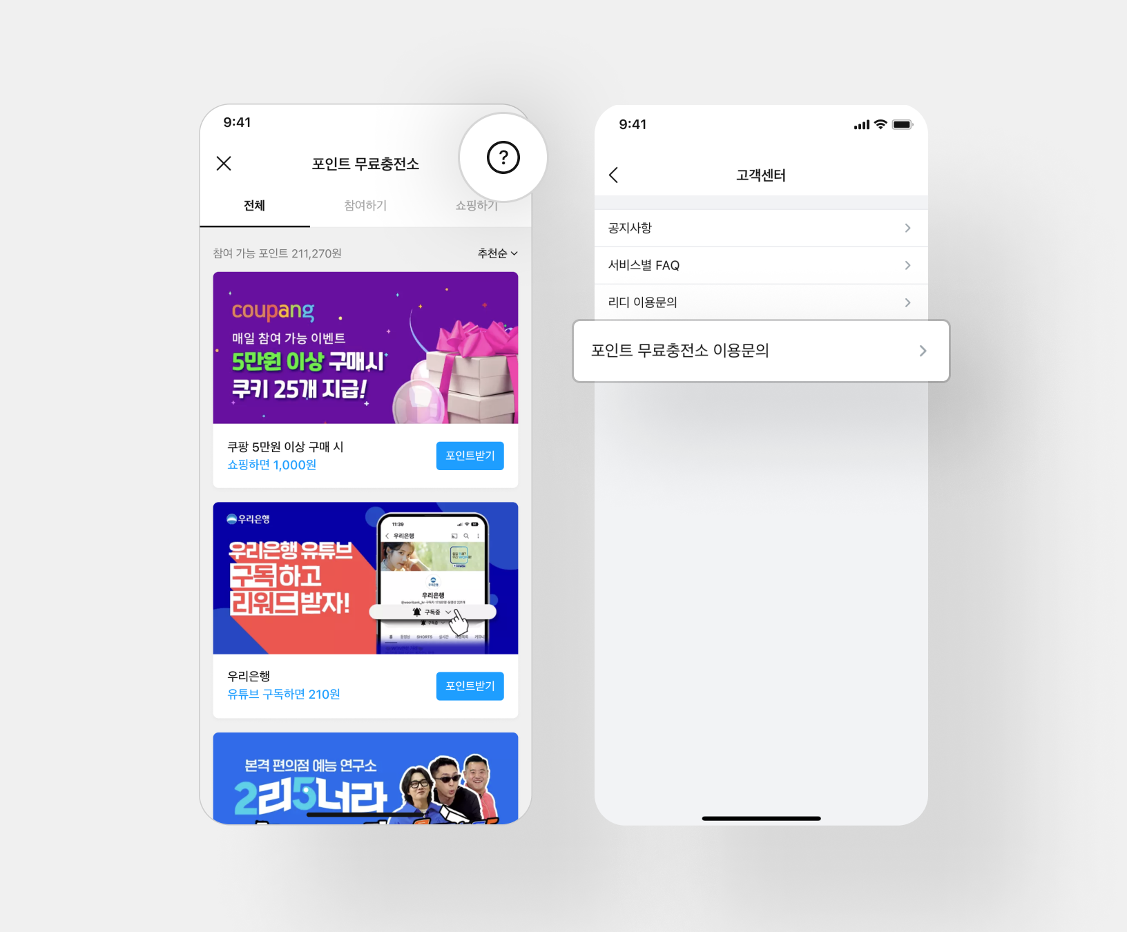 • [MY > 고객센터 > 포인트 무료충전소 이용문의]에서도 문의하실 수 있습니다